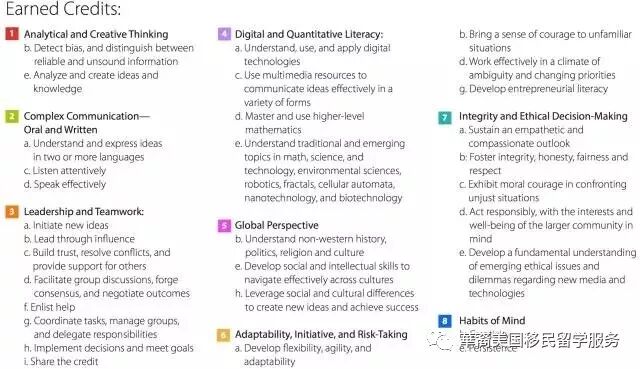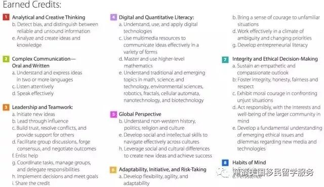 右边的一页纸是 A New Model 在高中期间持续追踪记录、评估的学生的 8项能力,每个大项中还有若干小项。