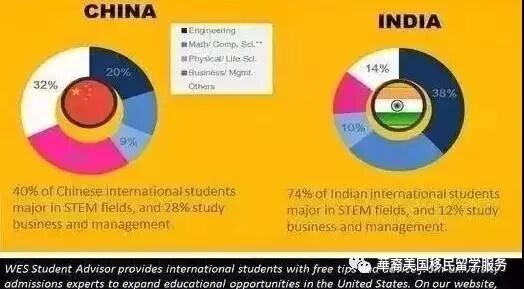 谈及地域对留学申请专业选择的影响,我们对比下来美留学生最多的两个国家:中国和印度。 STEM(科学、技术、工程、数学)专业领域在中国是最受欢迎的。工程(20%),数学/电脑科学(11%),生命科学(9%)在所有中国国际生中占40%。商业/管理同样是国内的专业峰值,占28%,而且近年来一直持续增长。商业类专业之中常选择的细分专业为金融、会计以及MBA。对于印度来说,毫无疑问,选择最多的同样是STEM领域专业,这一比例高达75%。在这个数据背后,工程占38%,但是商业类占比降低到了12%。