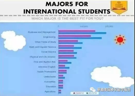 从表中数据我们可以看到商业/管理,工程和数学/电脑科技专业(其他专业依次为社会科学、生命科学、艺术类、英语、健康、人文、教育和农学)是留美国际学生选择最多的3个专业,一半以上的国际学生都会选择这3个专业之中的一个。 在过去的4年中,英语项目受欢迎程度是所有专业中是最大的,增长达67%。越来越多的国际学生申请ESL项目作为正式入学前熟悉美国文化和语言的桥梁课程。读完ESL课程的学生在申请其他专业时相比而言会显的更加自信。艺术类专业同样也有一个大幅度提升,与上一年度相比提高了43%。数学/电脑科学和工程专业分别增长了50%和34%。